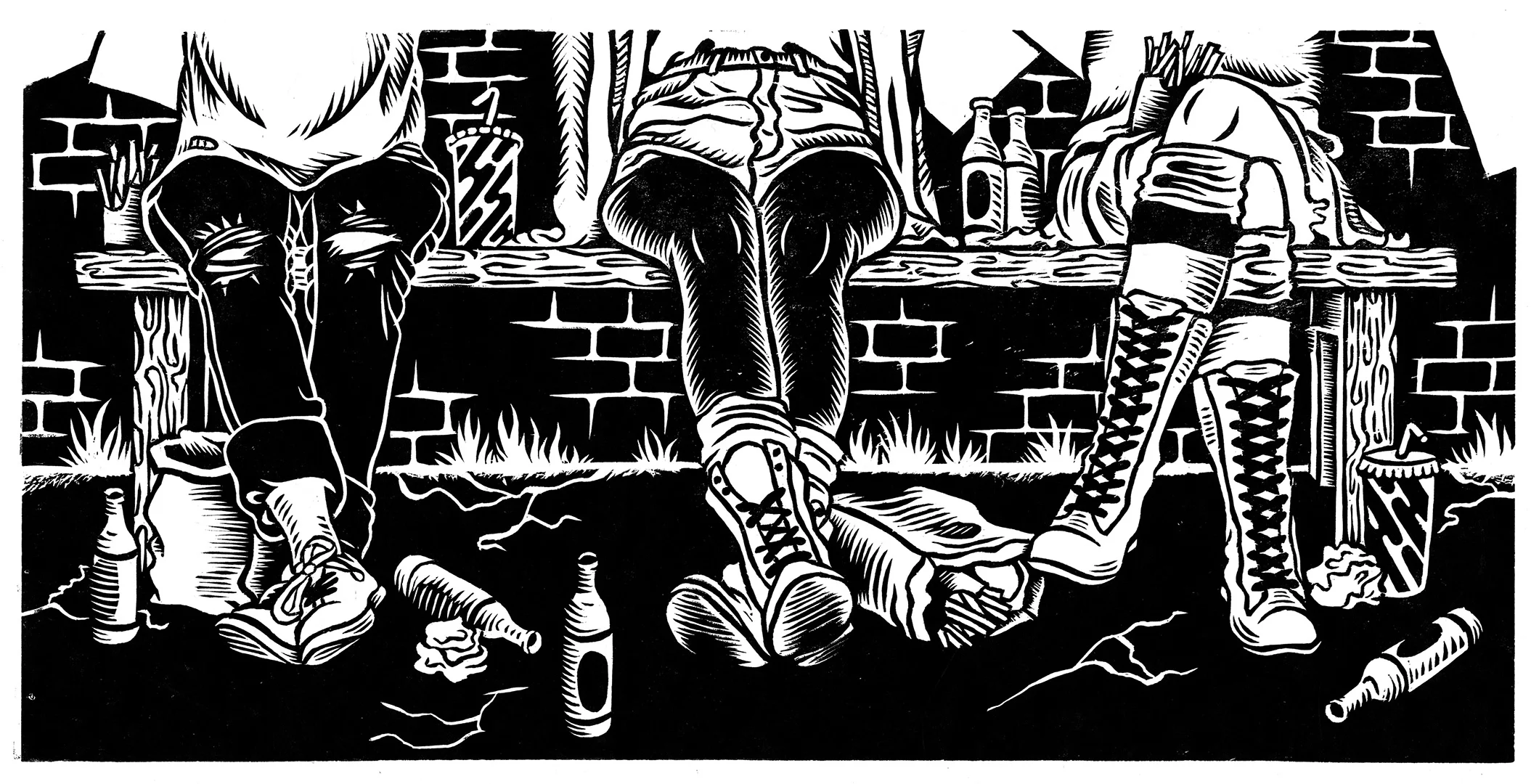 Woodcuts based on the early 90s Riot Grrrls, underground feminist movement a part of third wave feminism. Riot Grrr bands addressed issues such as rape, domestic abuse, sexuality, racism, patriarchy and female empowerment. These woodcuts depict womend doing what they want, when they want.